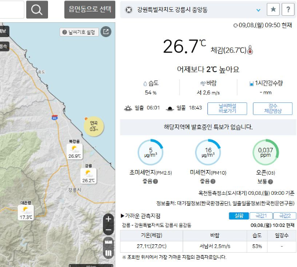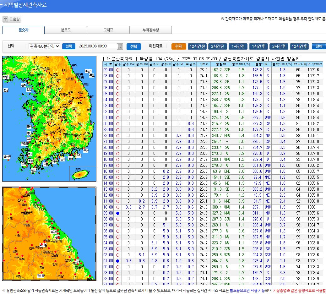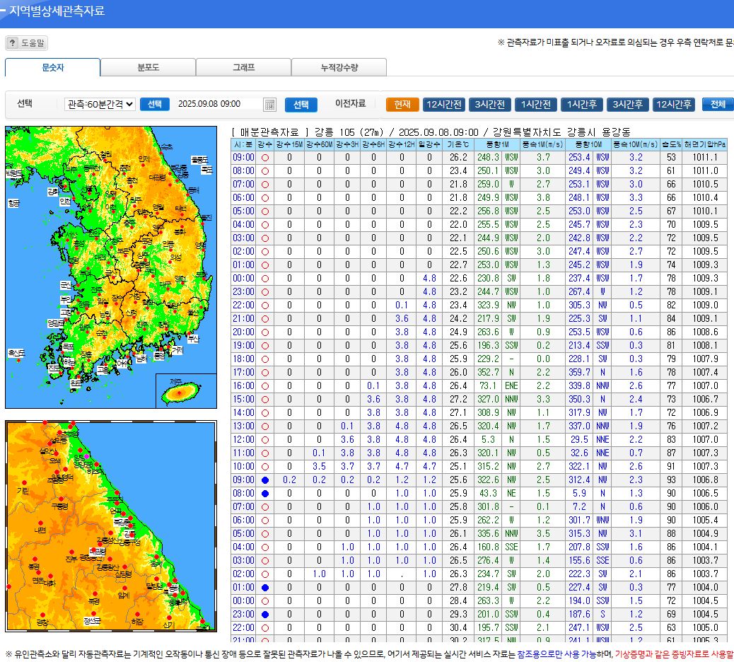 어제 강릉 일대에는, 저 발표자료가 만들어진 다음에 비가 좀 온 듯.