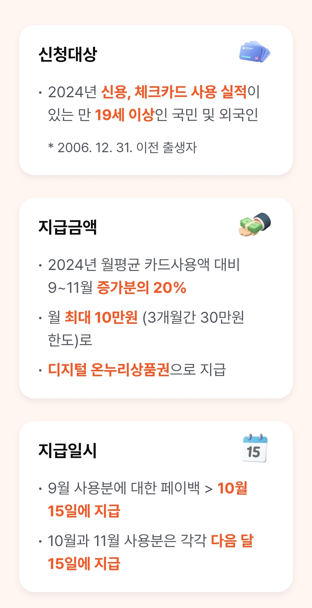상생페이백이란? 대규모 소비진작 유도 및 소상공인 등 취약계층 집중지원을 위해 ’24년 월평균 카드소비액 대비 ’25년 9월~11월 월별 카드소비액 증가분에 대하여 일정한 지원금을 디지털온누
