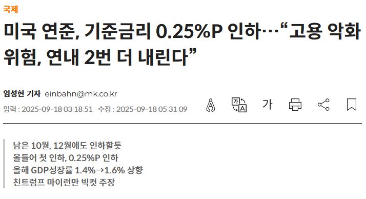 미국 연준, 기준금리 0.25%P 인하…“고용 악화 위험, 연내 2번 더 내린다” - 매일경제