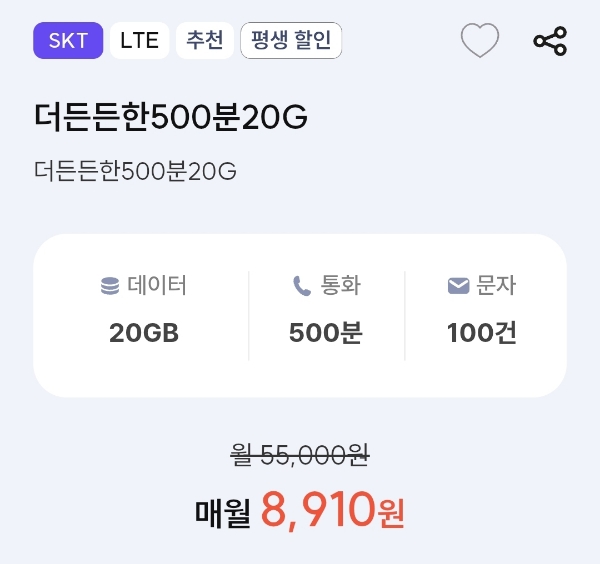 | 데이터 15GB, 통화 500분, 문자 100건 알뜰폰요금제 (매월 8920원 평생) (0) | 2025.09.27 |
