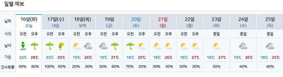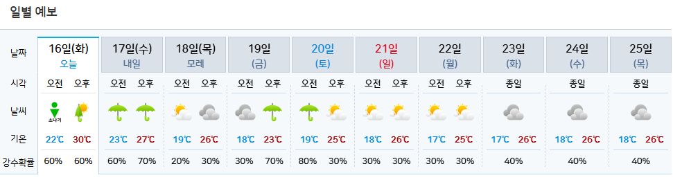 2025.9.16.화. ~9.25.목 날씨: 비, 흐림, 가을 기온 본문