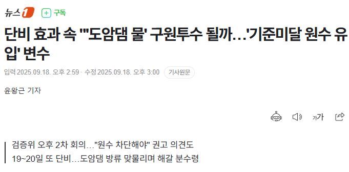 지금 홍제정수장의 공급량 하루 7만 톤은 대규모 사용처를 단수하고 급수차와 생수를 돌리는 지금 상태에서 그렇단 말이겠죠. 8월하순까지는 하루 8~9만 톤 정도였다니. 비가 매일 오는 게 아니므로, 이대로 불편을 감수하며 살 게 아니라면 도암물은 써야 할 것 같습니다.
