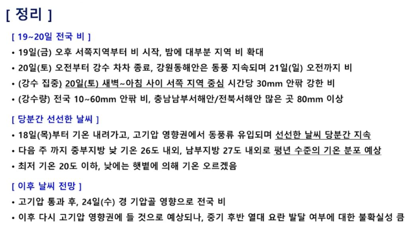 ㅡ 이번 주말 전국 비. 강우량은 곳에 따라 편차 심할테고, 집중해 내리는 뇌우도 있을 수 있으니 주의