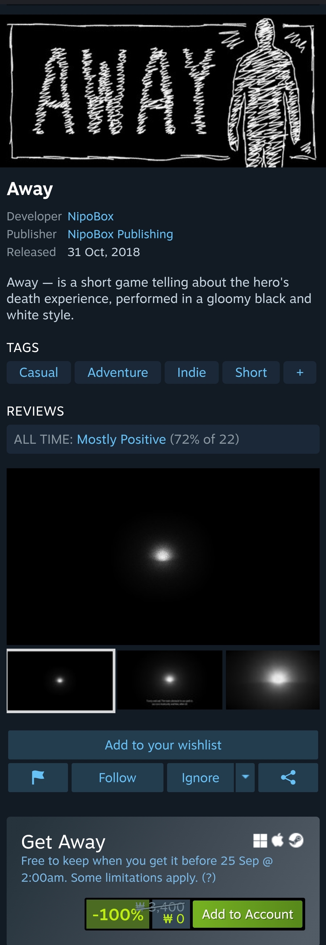 Away — is a short game telling about the hero's death experience, performed in a gloomy black and white style.