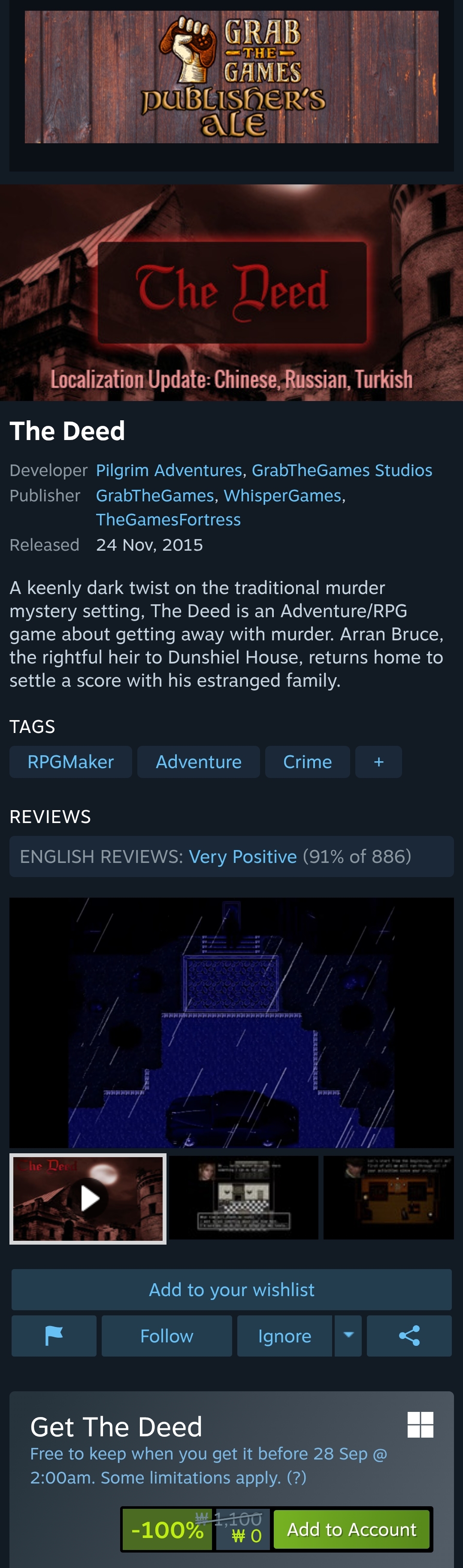 A keenly dark twist on the traditional murder mystery setting, The Deed is an Adventure/RPG game about getting away with murder. Arran Bruce, the rightful heir to Dunshiel House, returns home to settle a score with his estranged family.