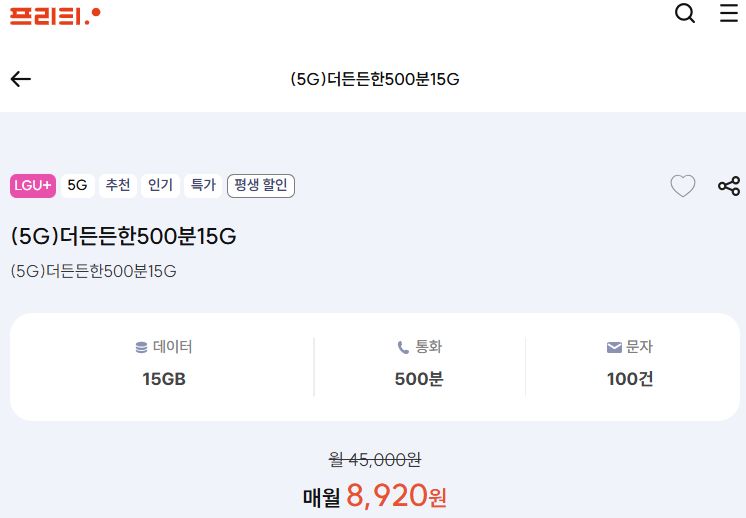 데이터 15GB, 통화 500분, 문자 100건 알뜰폰요금제 (매월 8920원 평생) 본문