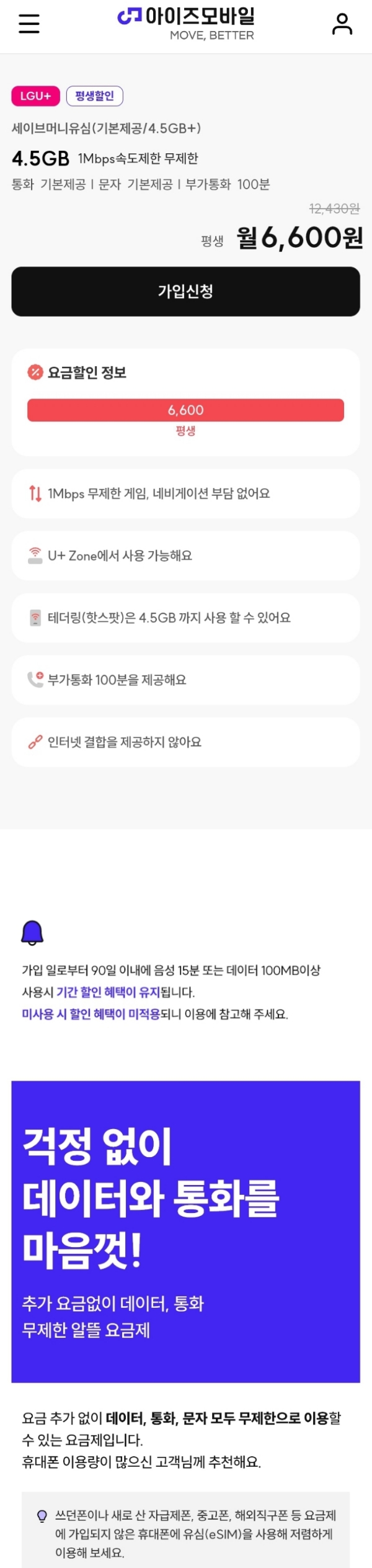 알뜰폰요금제, 4.5GB+1Mbps QoS 등, 월 6600원 본문