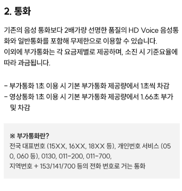 ㅡ 부가통화 100분 (영상통화는 무제한이 아니고, 부가통화제공량에서 1.66계산 차감)