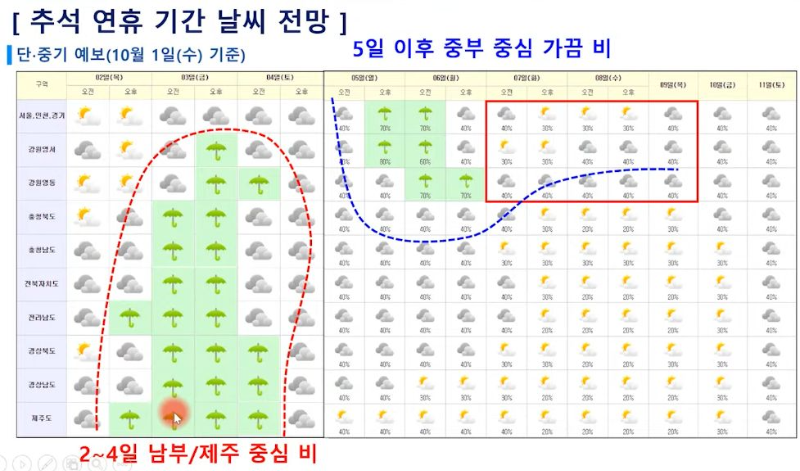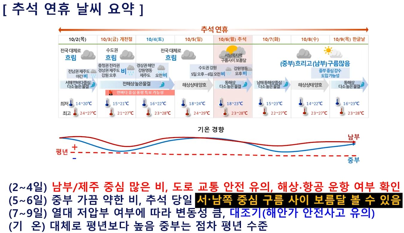 추석 연휴 날씨 전망. 3일 남부 제주 많은 비 (2025년 10월 1일 기상청 예보브리핑)