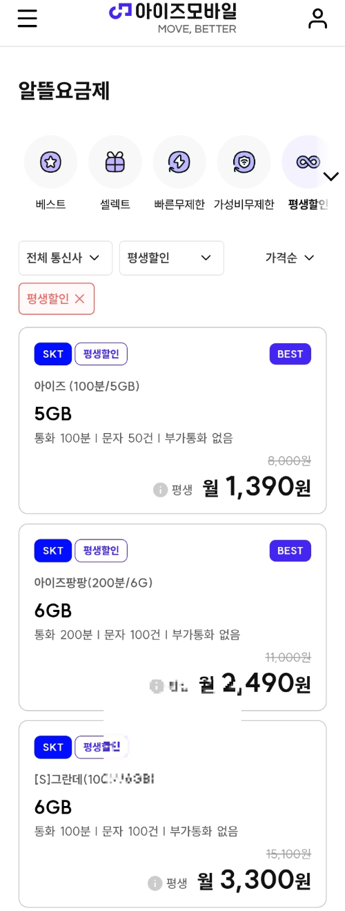 아이즈모바일 링크입니다. 여기는 평생할인 태그가 있어서 이런 요금제를 보기 쉽습니다.1