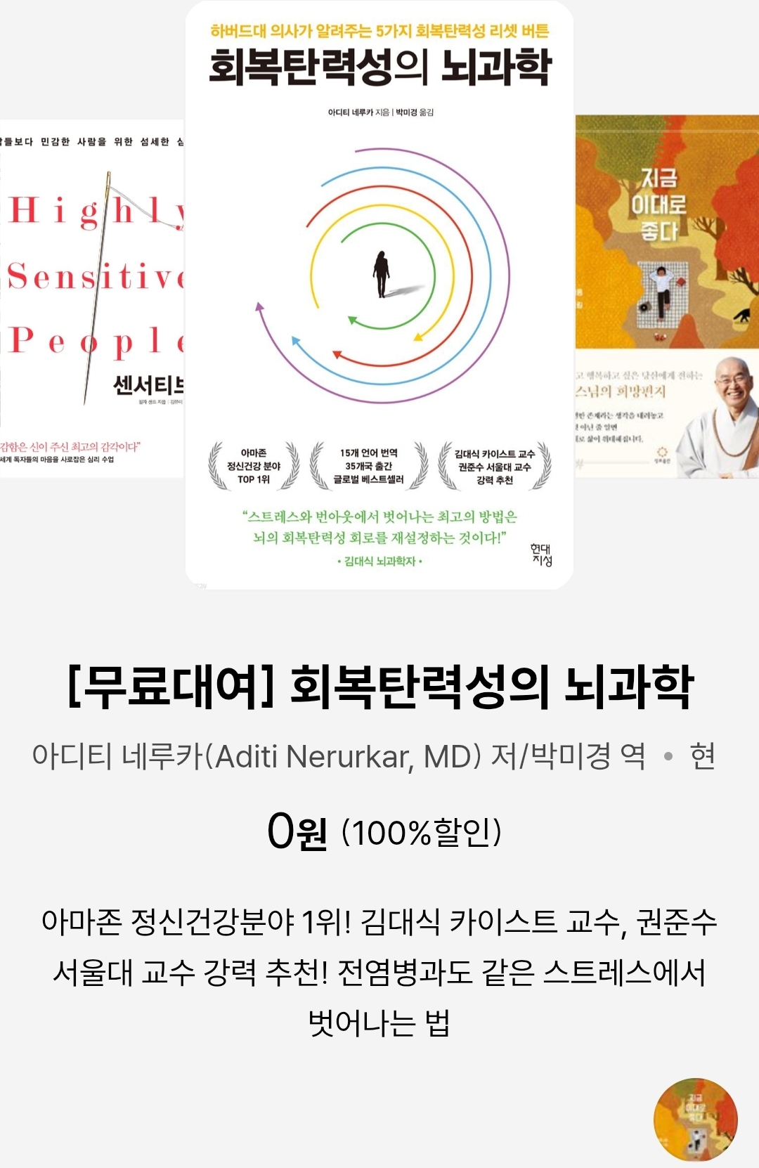 | (예스24, 추석연휴 무료대여 전자책) 회복탄력성의 뇌과학: 하버드대 의사가 알려주는 5가지 회복탄력성 리셋 버튼 (아디티 네루카) (0) | 2025.10.04 |