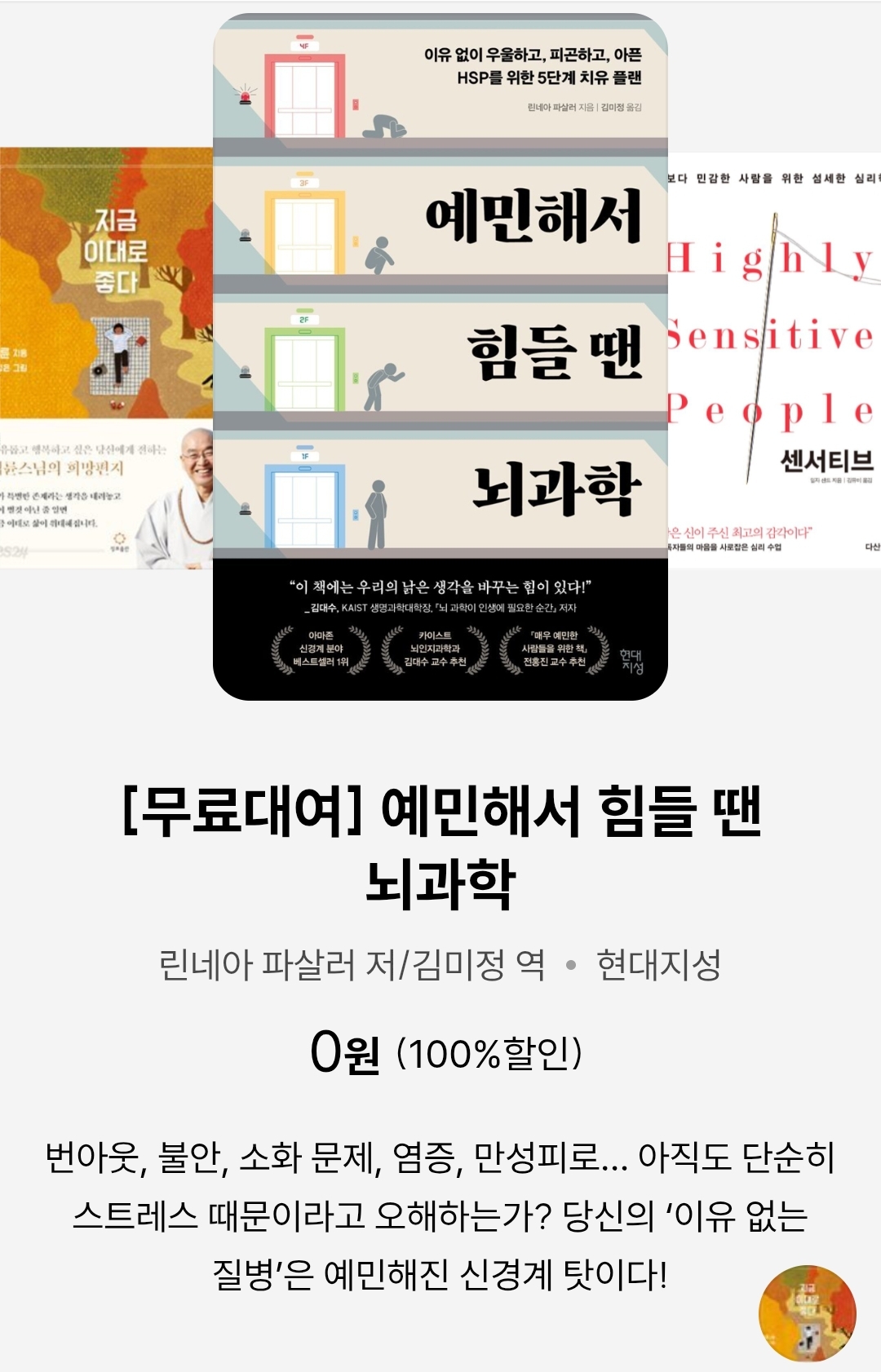 | (예스24, 추석연휴 무료대여 전자책) 예민해서 힘들 땐 뇌과학 이유 없이 우울하고, 피곤하고...... (린네아 파살러) (0) | 2025.10.04 |