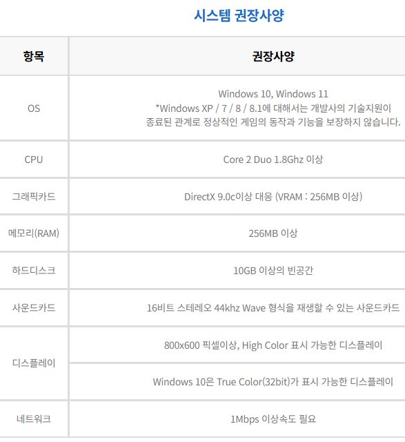 최저사양은 이렇고, 작년 서버이관 전에 로그인해보니 구형 컴퓨터로도 플레이하는 데 문제없었습니다.