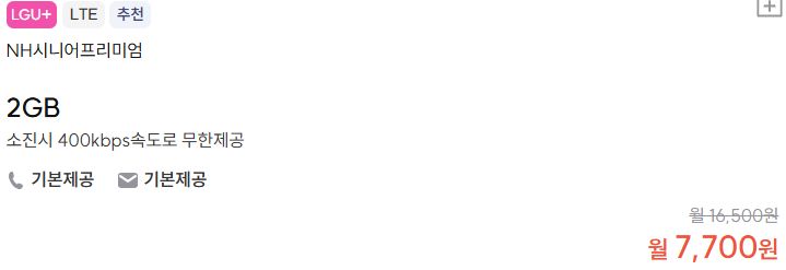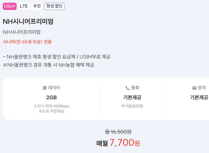 NH시니어프리미엄(통화문자 기본제공, 2GB+400kbps QoS)