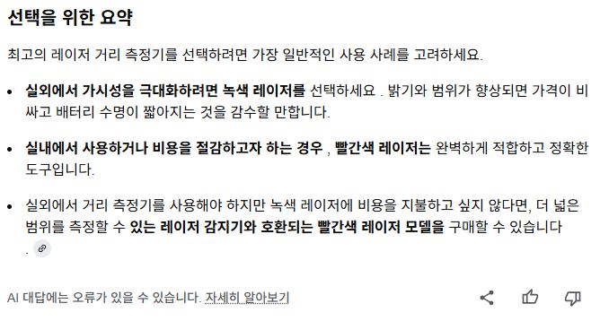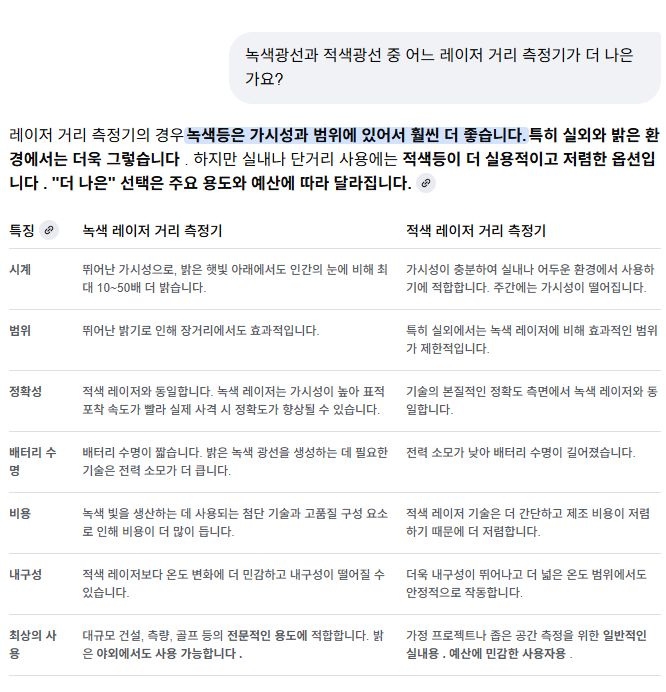 레이저 거리측정기, 녹색광과 적색광 비교, AI에게 물어본 것 등 본문