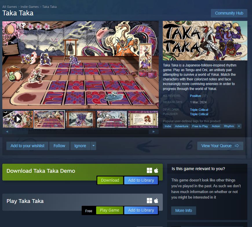 Taka Taka is a Japanese-folklore-inspired rhythm game. Play as Tengu and Oni, an unlikely pair attempting to survive a world of Yokai. Match the characters with their colorized notes and face increasingly more conniving enemies in order to progress through