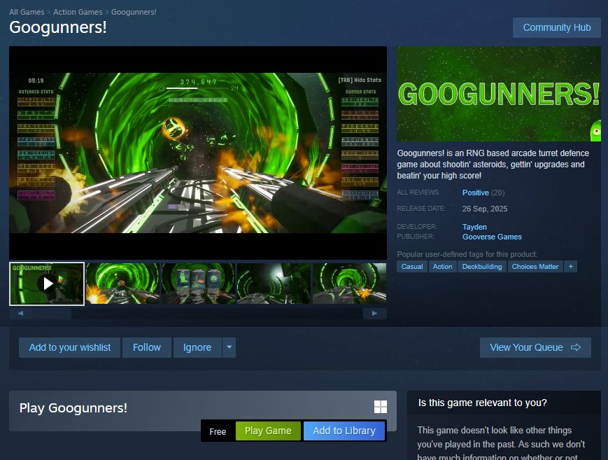 Googunners! is an RNG based arcade turret defence game about shootin' asteroids, gettin' upgrades and beatin' your high score!