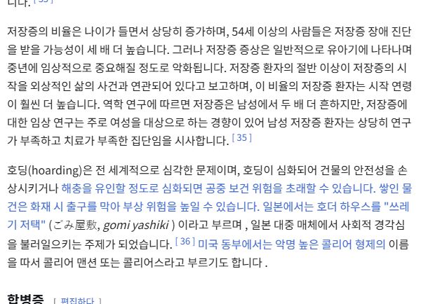 나이도 다르고 행동의 내용도 다릅니다. 저장강박장애는 결국, 옛날에는 고물상에서 쓸모를 가졌던 물건이 지금은 폐기물처리장/소각장으로 직행하는, '물건이 귀하지 않은 산업사회'라서 더 두드러지는 지도 모릅니다.