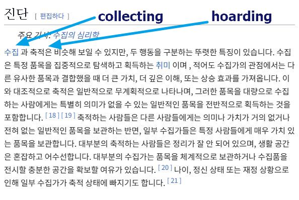어제 TV에서 본 할머니의 경우는, 자기도 내가 왜 그러는지 모르겠다며 그런 행동을 안 해도 편할 수 있다면 그러고 싶다고 말하니까, "나는 정상이다"라고 우기는 부류는 아니었습니다. 그분 역시, 온 동네를 돌아다니며 본인의 눈에 쓸모를 가진 물건을 모아와 집에 쌓아두어야(=그분 나름대로는 정리해두어야) 마음이 편안해지기 때문에 그러는 것이고, 못 버틴 할아버지는 항복하고 같이 사시고, 자녀들은 근처에 방을 얻어 나가 사는 형편이었지만.