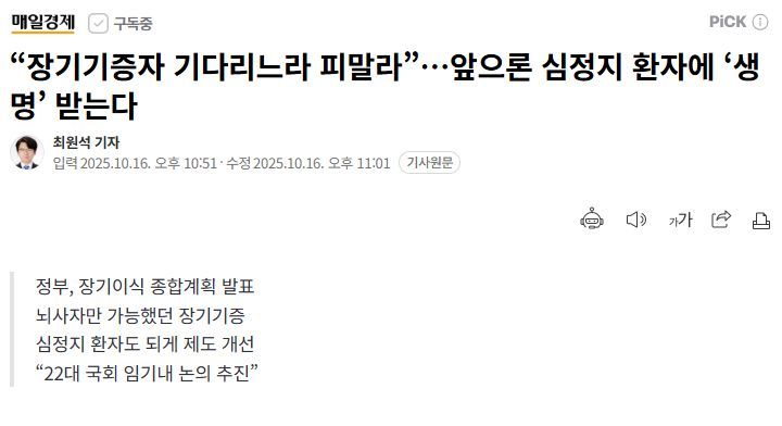 장기이식법과 연명의료법 개정이 필요하고, 종교계와 시민단체의 반발 예상 - 매일경제 2025.10.