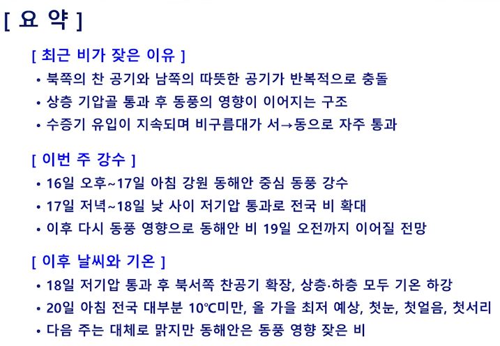 일요일부터 기온 뚝! 월요일 아침 더 추워집니다! 첫눈과 첫서리 가능성까지! (2025년 10월 16일 기상청 예보브리핑)