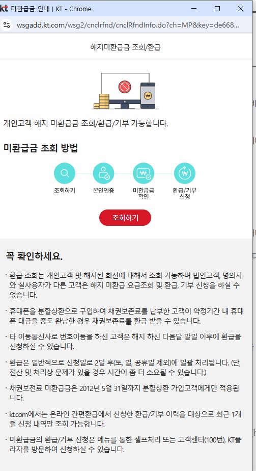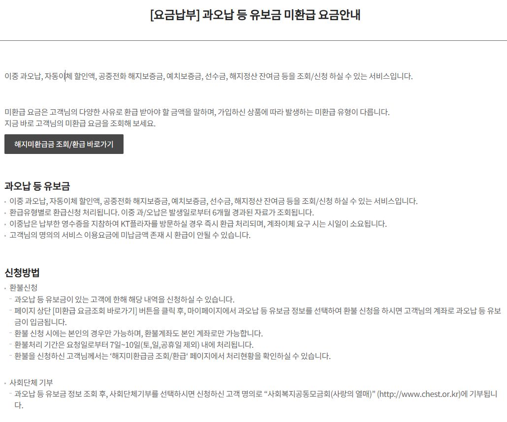 과오납 등 유보금 미환급 요금안내 | KT