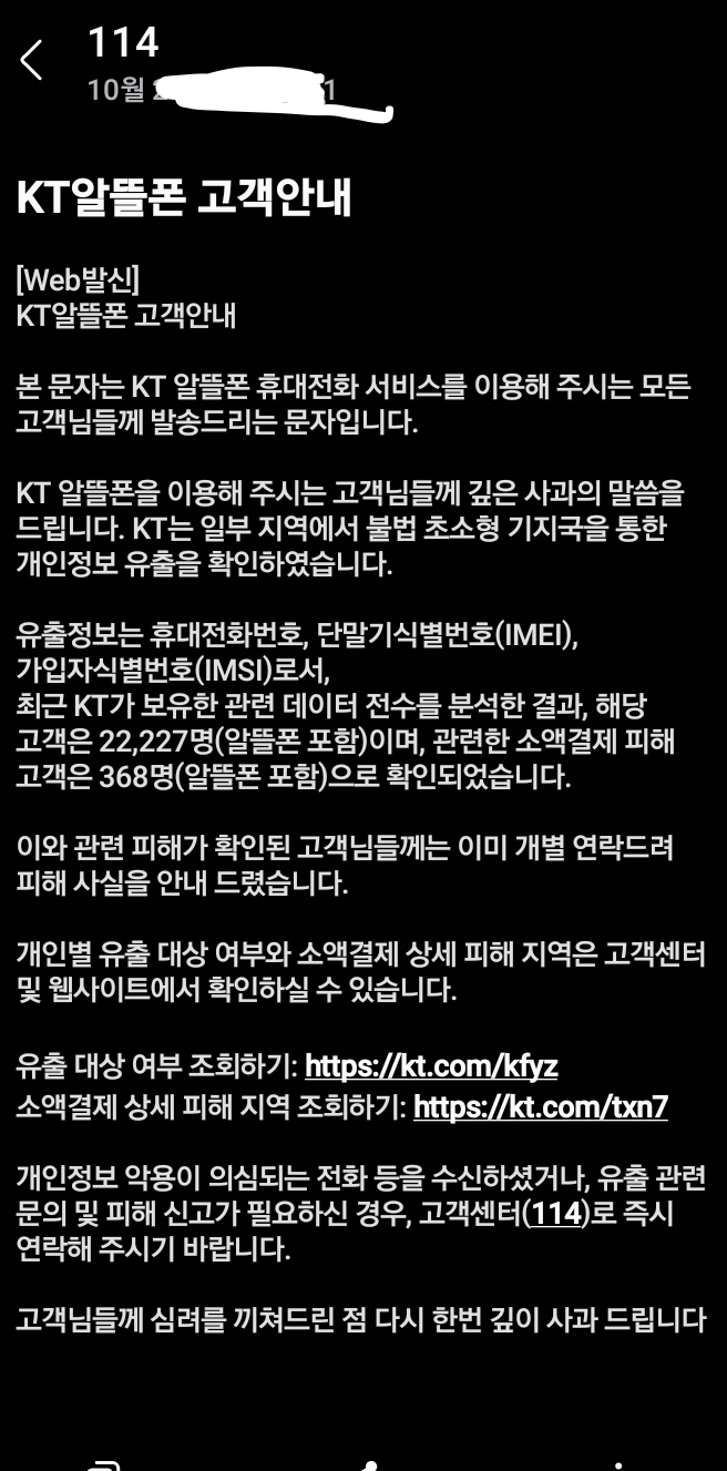 유출 대상 여부 조회하기: https://kt.com/kfyz