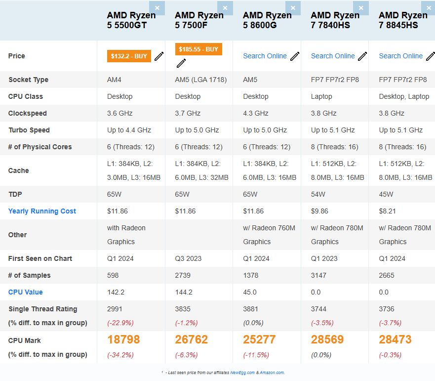 AMD Ryzen 5 5500GT vs Ryzen 5 7500F vs Ryzen 5 8600G vs Ryzen 7 7840HS vs Ryzen 7 8845HS [cpubenchmark.net] by PassMark Software