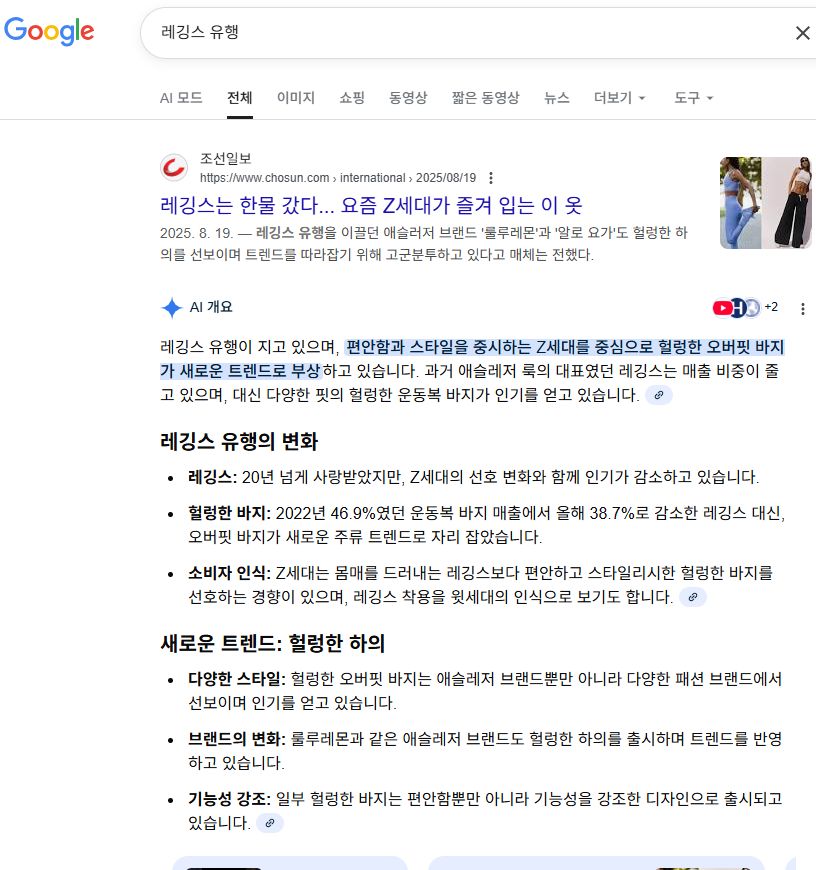 ㅡ (......) “10년 넘게 옷장 속을 지배해온 레깅스가 이제 더 이상 젊은 소비자들의 기본 아이템이 아니다” (......) “심지어 헬스장에서조차 레깅스를 입는 사람이 줄고 있다” - 한국경제신문 2025.10.28.