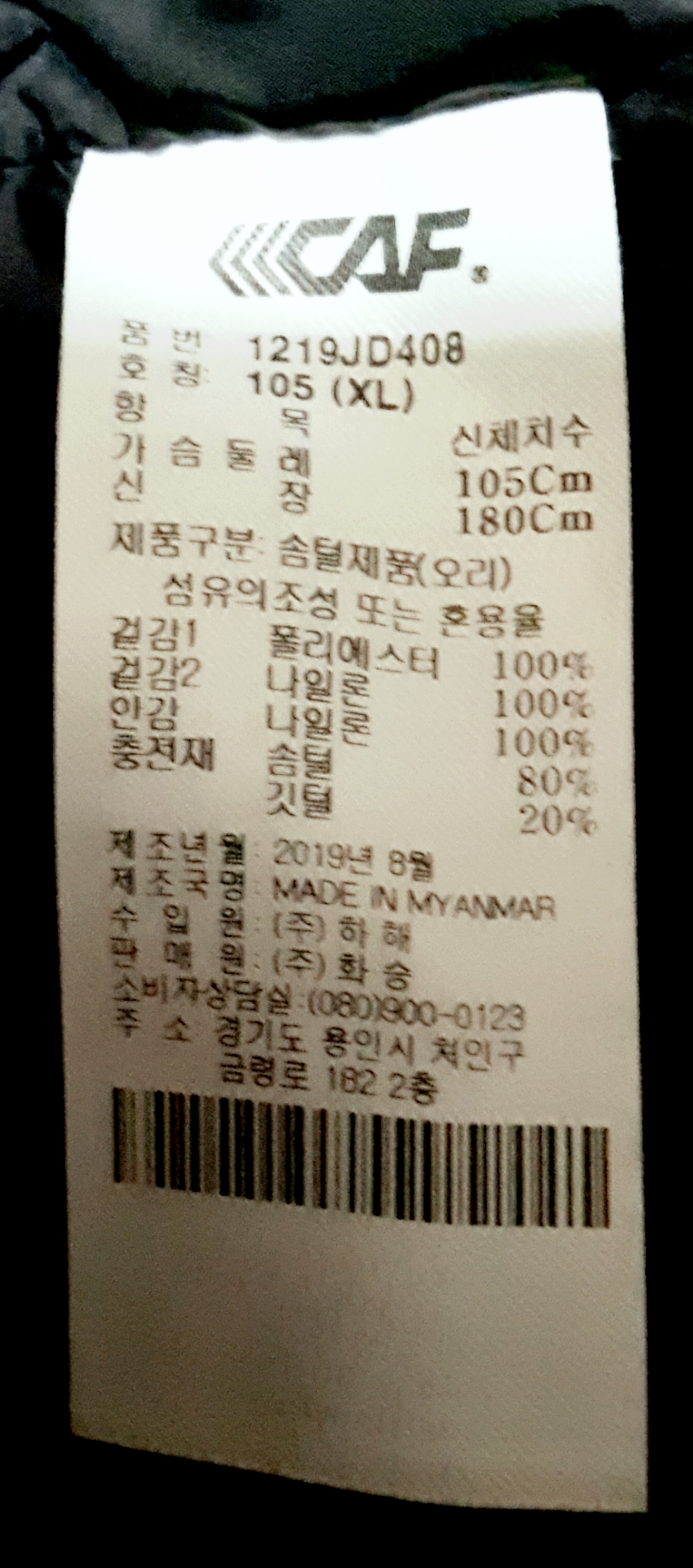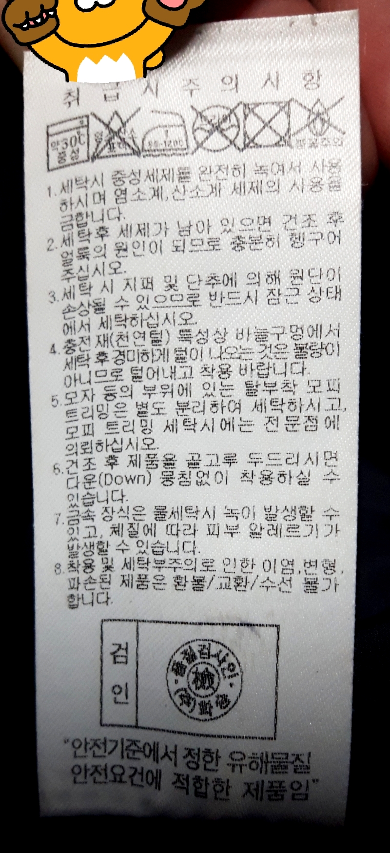 어떤 오리털 패딩의 세탁정보 태그 본문