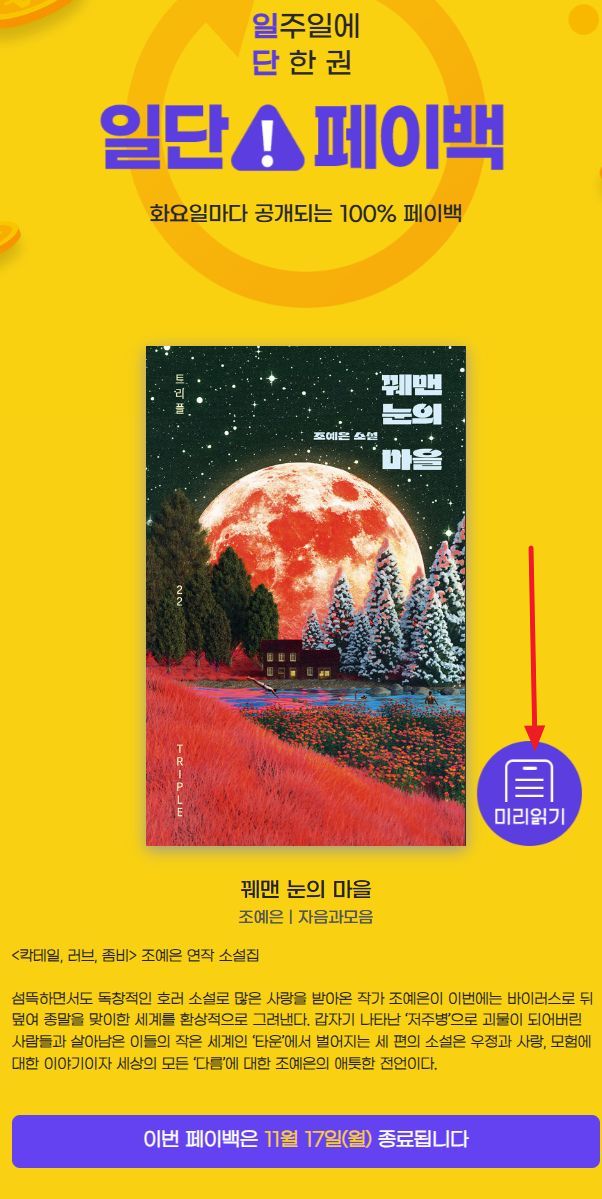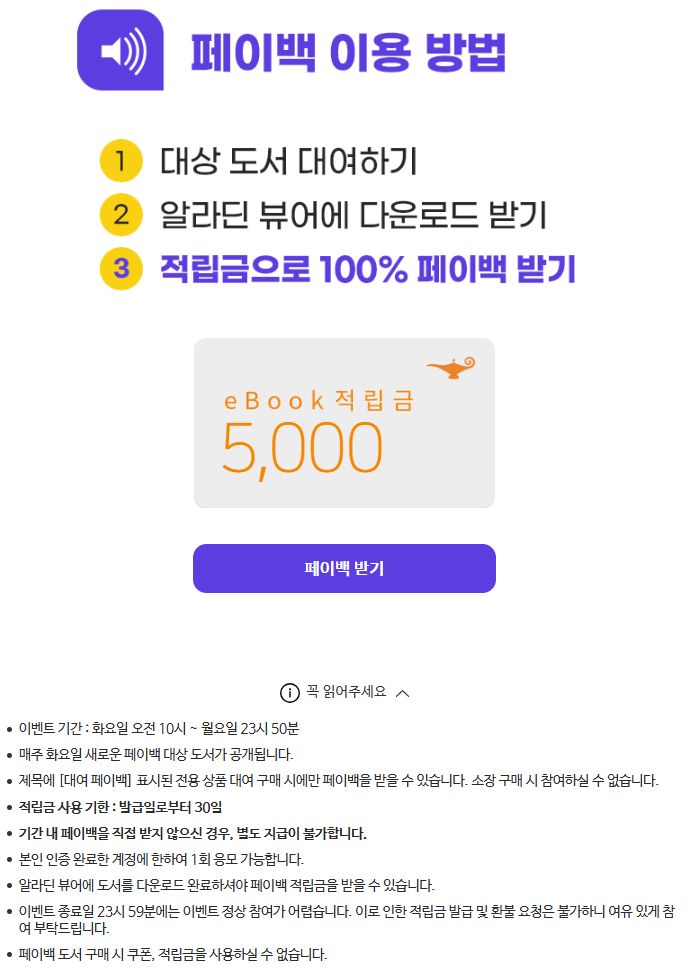 이 90일 대여 전자책값을 카드나 이체로 실결제한 다음, 다운받아(다운받아야 대여 카운트가 시작되기 때문) 읽으면서 아래 이벤트페이지에서 페이백 버튼을 누르는 미션을 클리어하면, 결제한 책값이 30일짜리 전자책전용 적립금으로 돌아옵니다. 전자책살 일 있을 때 겸사겸사 이용하면 좋은 이벤트.