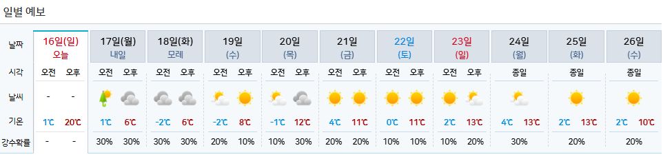 2025.11.16.일.~11.26.수. 늦가을 날씨. 최저기온 0~영하2도 본문