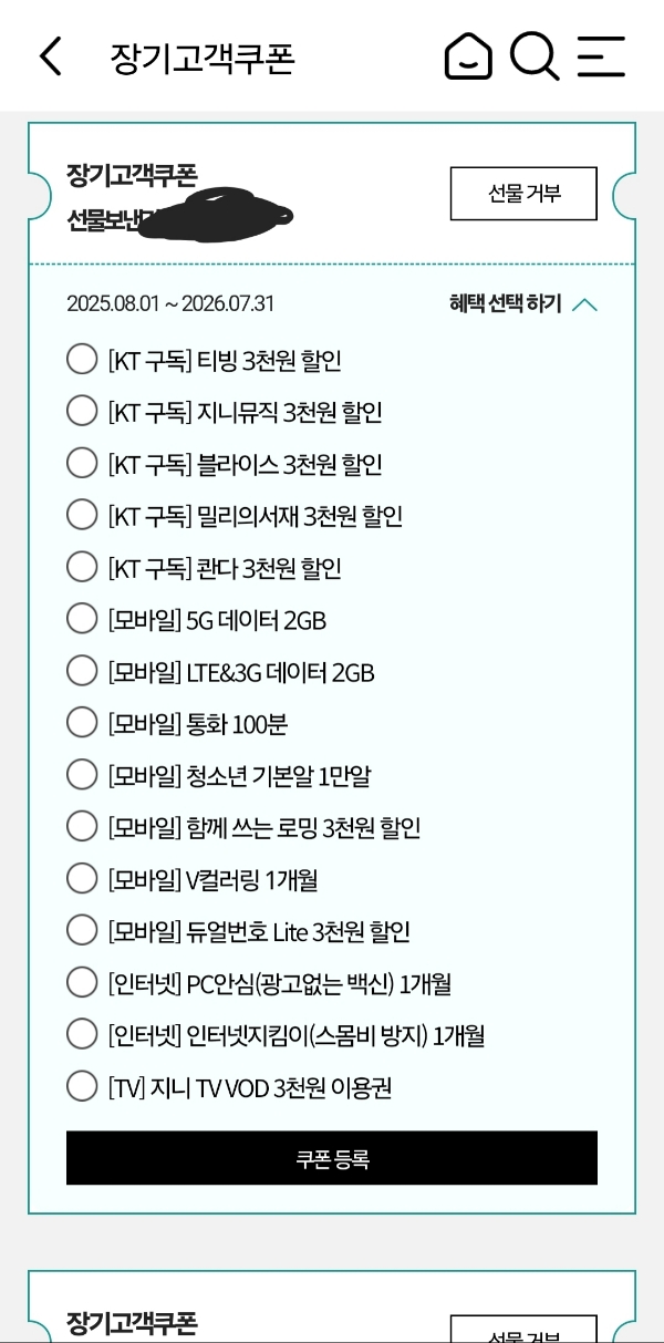 KT 장기고객쿠폰은 선물할 수 있지만, 선물한다고 해서 유효기간이 늘어나지는 않습니다. 개선희망점 본문