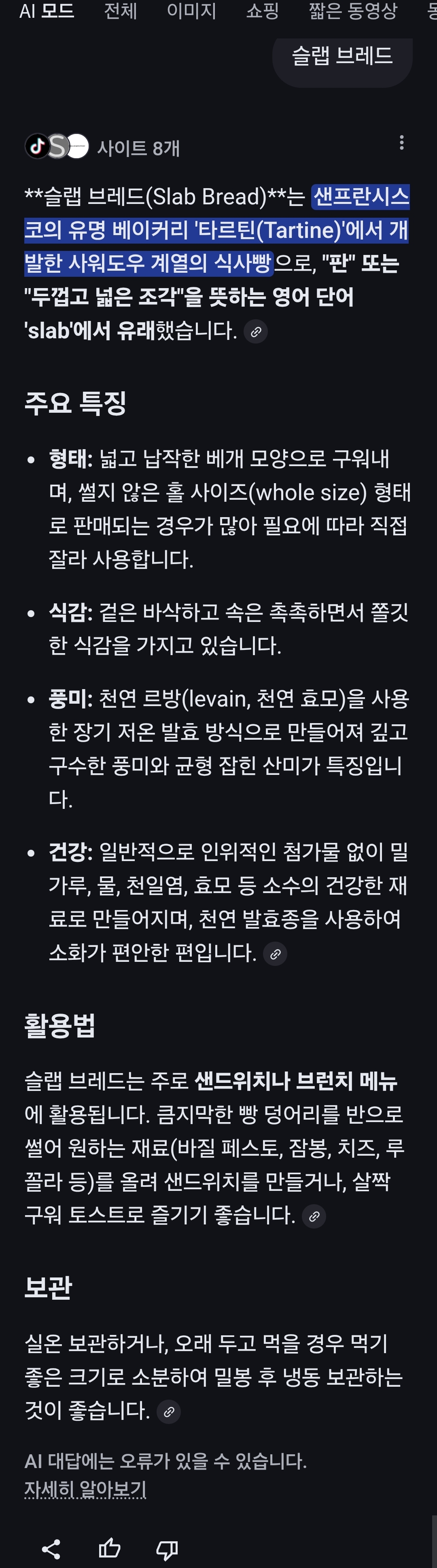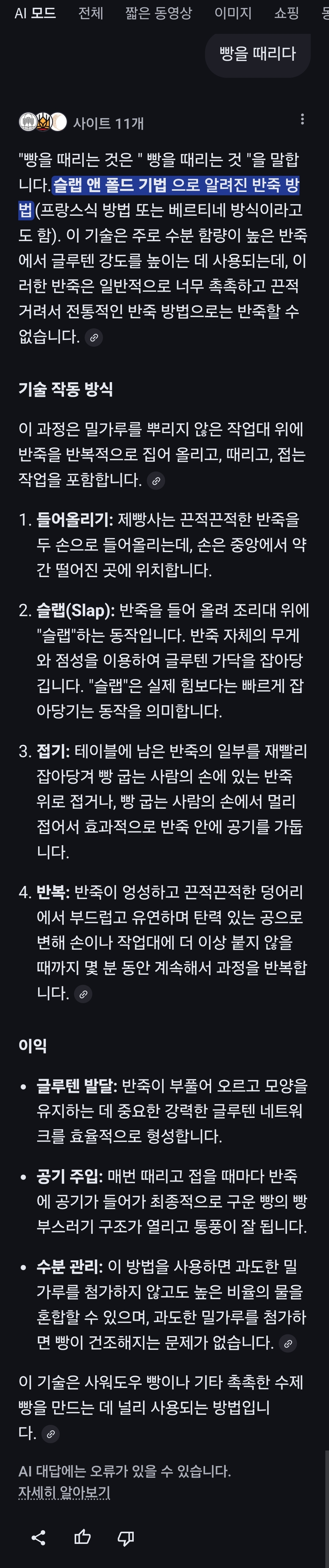 이런 빵반죽 기법이 그 샌프란시스코 빵집의 슬랩 브레드와 무슨 상관이 있는지는 잘 모르겠다. 하지만 겉바속촉, 사워도우, 빵의 모양과 대강의 반죽방식이 동일해보이는데 왜 첫 번째 AI대답은 그 빵집에서 "개발"했다고 한 걸까? 궁금하네.