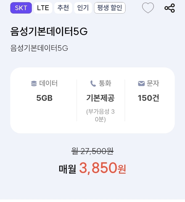 프리티SKT) 음성기본데이터5G (월 3850원)