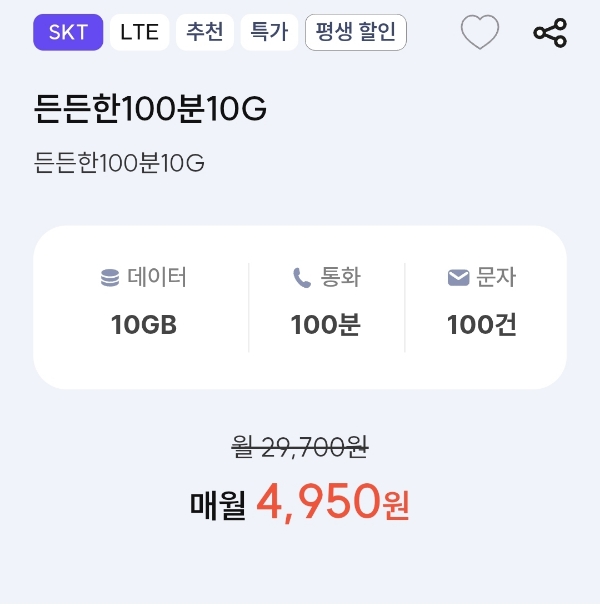 프리티SKT) 든든한 100분 10G (월 4950원)