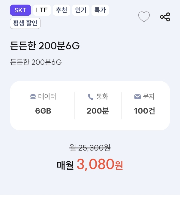 프리티SKT) 든든한 200분6G (월 3080원)