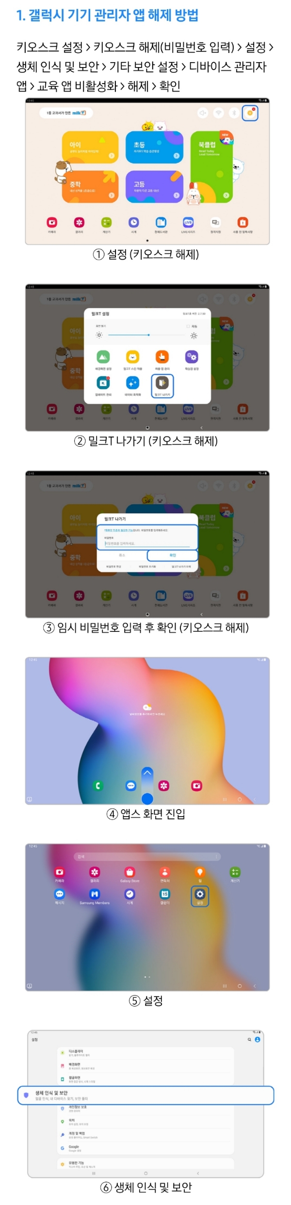 삼전 서비스센터에서 제공하는 방법은 원착적인 이야기고, 실제로는 교육용앱깔아 유통한 회사의 고객센터와 통화해 그쪽에서 풀어주는 과정 필요.