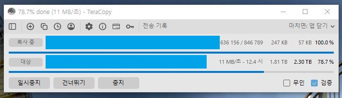 (테라카피는 작업이 끝난 다음에 verify도 하고, 문제생긴 파일 목록을 로그로 남겨준다는데, 이런 기능에 관심가진 건 이번이 처음이라 어떨지 모르겠습니다)