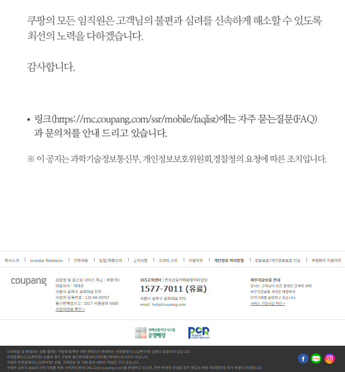 쿠팡이 안 좋은 점은, 제대로 된 팝업 공지조차 하지 않는다는 점입니다. /:/ 개인정보보호위 지시에 따른 재공지 본문