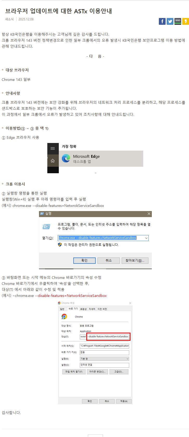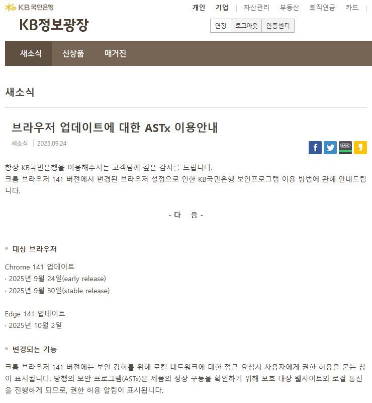 KB국민은행 PC웹 사이트, 보안플러그인 공지 본문