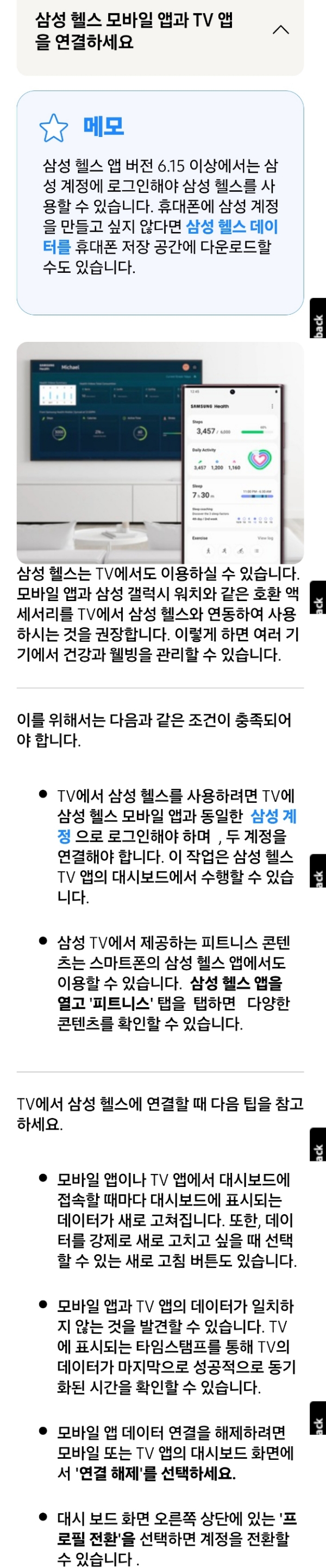 삼성 헬스 모바일 앱과 TV 앱을 연결하세요