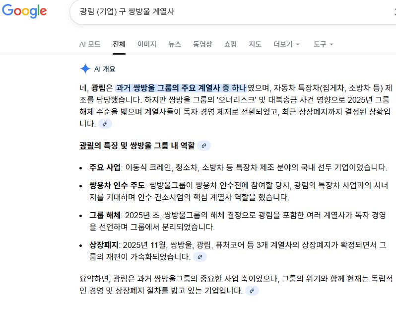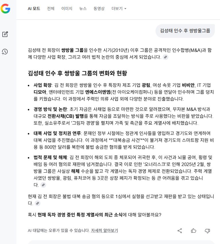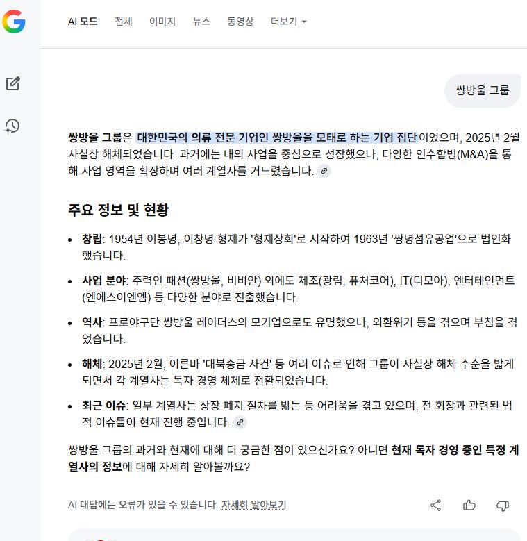 쌍방울(의류회사)와 그것의 모회사 그룹관련 구글 AI대답들 본문