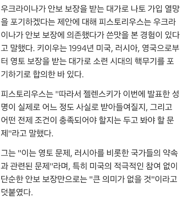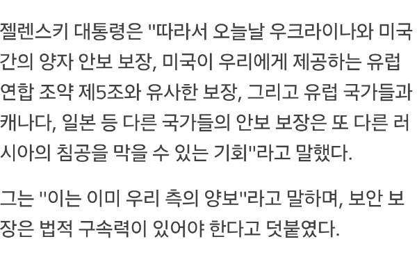 "안보조약"이란, "안전보장조약"의 준말입니다. 휴지조각으로 끝난, 우크라이나가 핵무기를 포기할 때의 선언적 안전보장과는 다른, 관계국들이 우크라이나에 대해 명확한 의무를 지는 공수동맹 또는 방어동맹 조약을, 우크라이나는 영토포기의 대가로 원합니다.