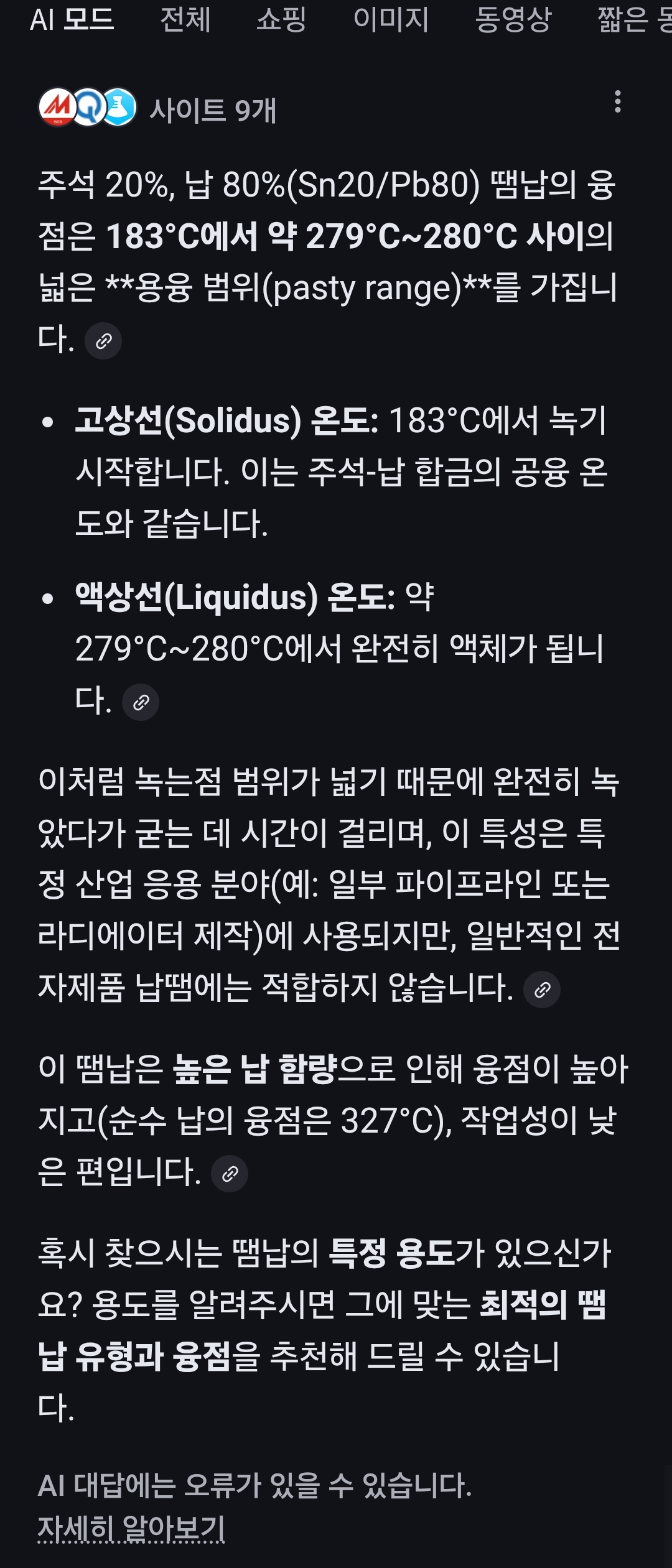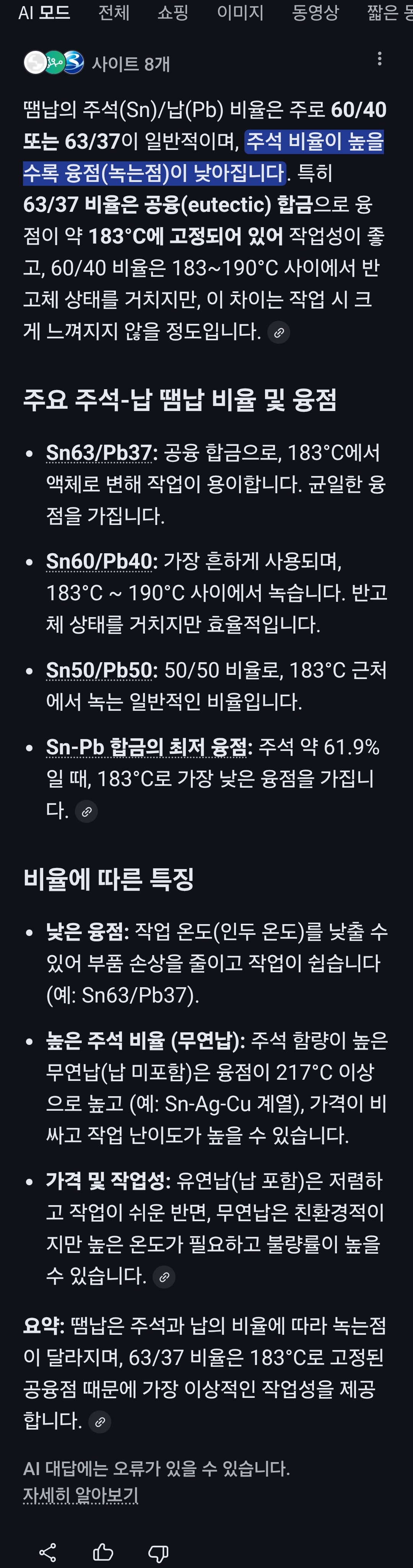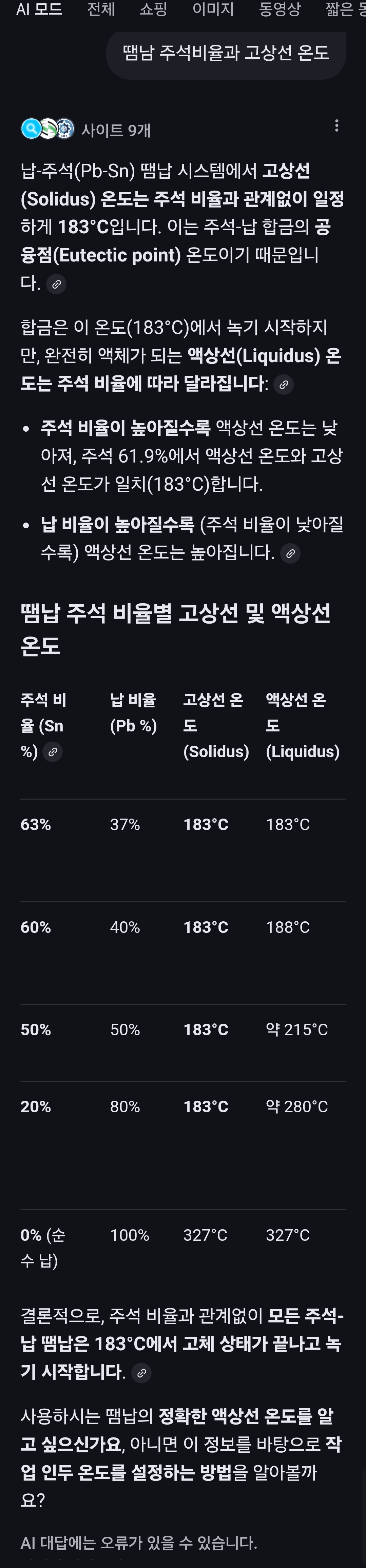 납땜 땜납의 주석, 납 비율과 녹기 시작하는 온도, 완전히 액체가 되는 온도: AI챗봇 본문