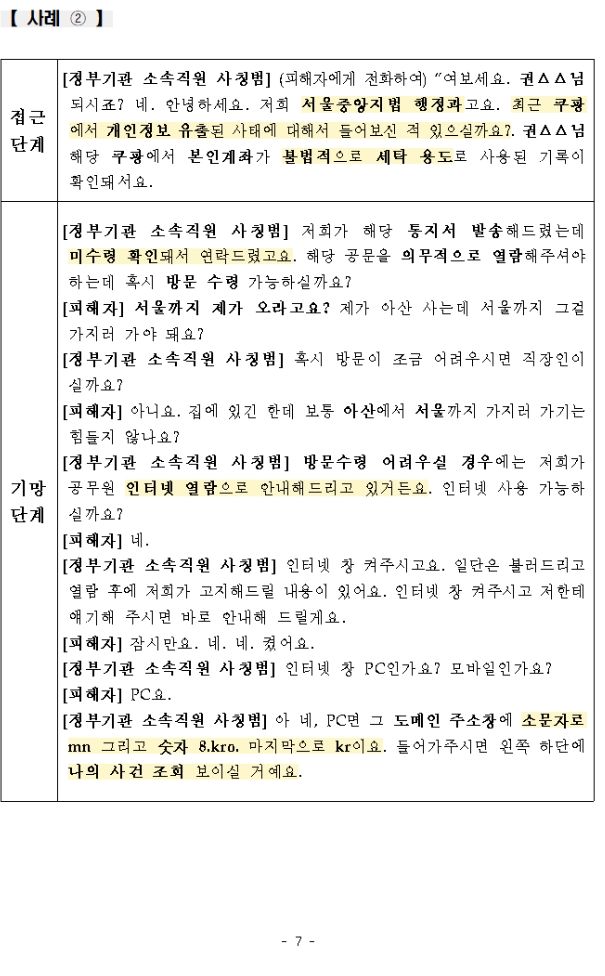 피해사실을 확인해주겠다거나 피해가 발생했다거나 등기가 어쩌구 등 거짓말해 피싱사이트 접속 유도,