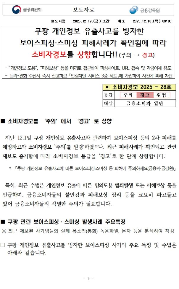 쿠팡 개인정보 유출 사건의 불안감을 악용한 금융사기 피해 발생 (기사)/:/ 금융감독원 보도자료 2025.12.19. 본문