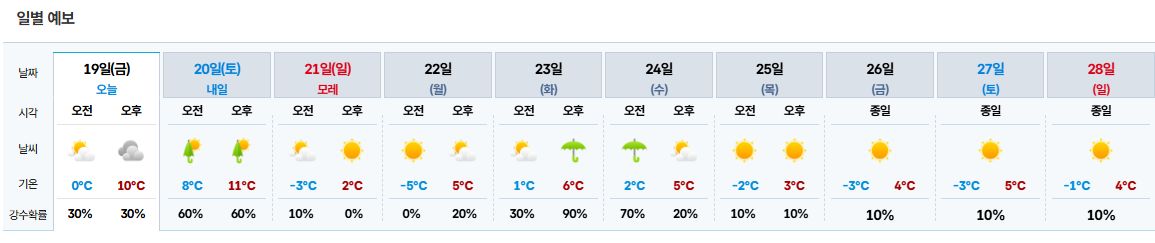 | 2025.12.10. 주간 날씨: 주 후반 비가 가볍게 뿌리는 날 있음 (0) | 2025.12.10 |