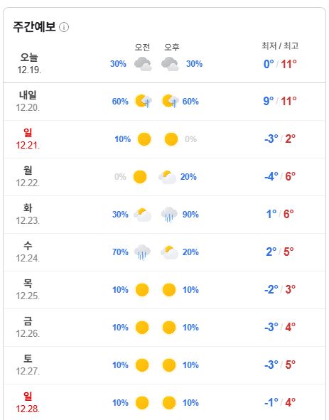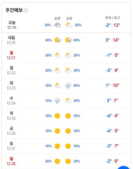 | 2025.12.20. 주말 및 주간 날씨 (기상청) (0) | 2025.12.20 |