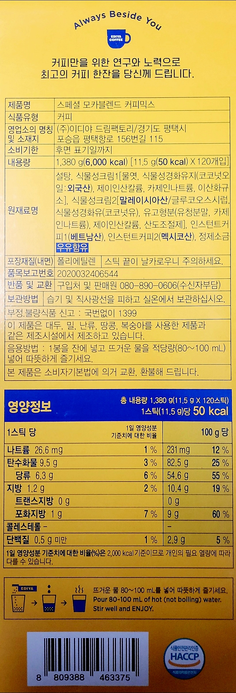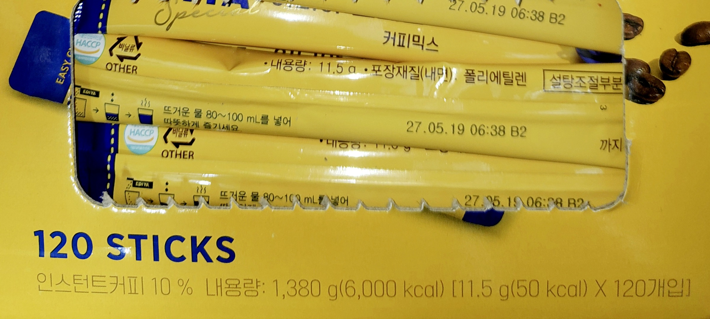 1T당 무게는 11.5g이고, 인스턴트커피 함량은 10%입니다. 제가 살 때 보았던 그 판매자 상품설명 이미지(12%)보다 줄었네요. 이건 새 출고분인가.